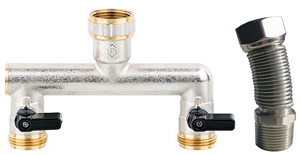 Kombination aus Zweifachhahn Messing vernickelt (Ø 27 mm) und biegbarem Wellrohr aus Edelstahl. Der Neigungswinkel kann mittels Verbiegung des Wellrohres angepasst werden. Maximale Durchflussmenge: ca. 4000 l/h. Eingang ¾" IG (ÜWM) + 2 Abgänge ¾" AG. Geeignet für mittelgrosse bis grosse Bewässerungssysteme.