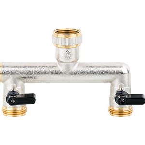 Zweifachhahn (Ø 20 mm) aus Messing vernickelt, 3/4" IG (ÜWM) + 2 Abgänge 3/4" AG. Maximale Durchflussmenge: ca. 2500 l/h. Geeignet für kleine bis mittelgrosse Bewässerungssysteme.
